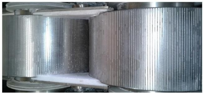 粉狀物料定量、均勻地加入軋片主料斗,使軋片主料斗內(nèi)保持恒定的料位,然后由軋片主料斗內(nèi)的縱向錐螺旋對(duì)粉料進(jìn)行預(yù)壓縮并輸送至兩只壓輥的弧形槽口的物料咬入槽內(nèi)并瞬間強(qiáng)制壓 縮,物料經(jīng)壓縮成形后承受的壓力逐漸減小,在其彈力及重力作用下,從槽內(nèi)脫落,進(jìn)入破碎整粒 系統(tǒng),然后根據(jù)用戶的粒度要求過(guò)篩、分級(jí),得到符合質(zhì)量要求的均勻顆粒狀產(chǎn)品。篩下粉重新返   回料斗循環(huán)利用。(在壓塊時(shí),粒狀物料在兩個(gè)反向旋轉(zhuǎn)的輥?zhàn)又g被壓實(shí),壓塊可使用粘結(jié)劑。)